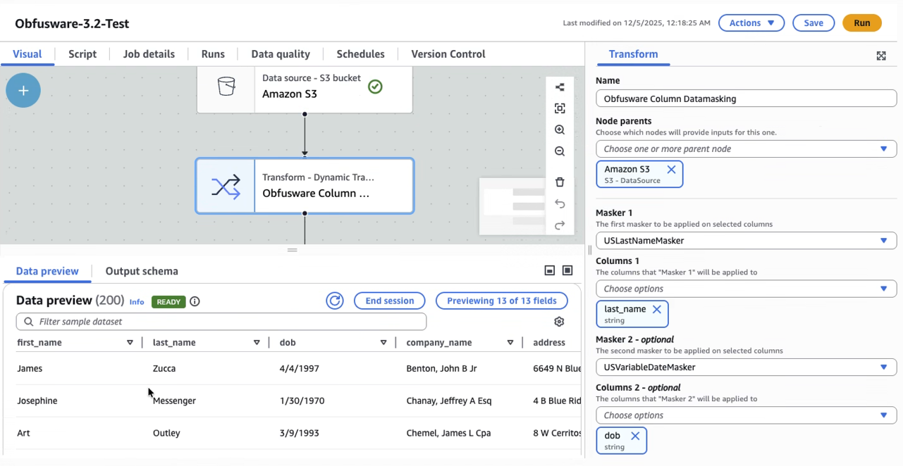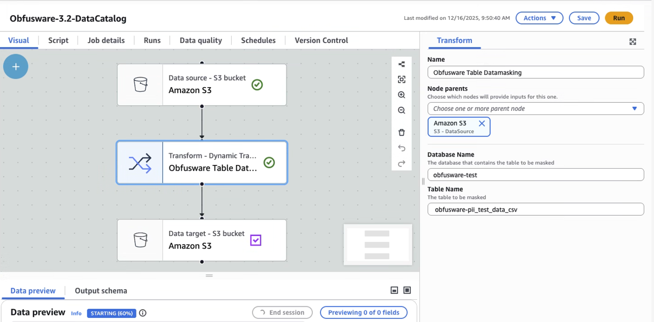 Obfusware integrates with the Glue Data Catalog to enable configuring data masking in the Catalog so that Jobs can be created without having to know the data masking requirements.